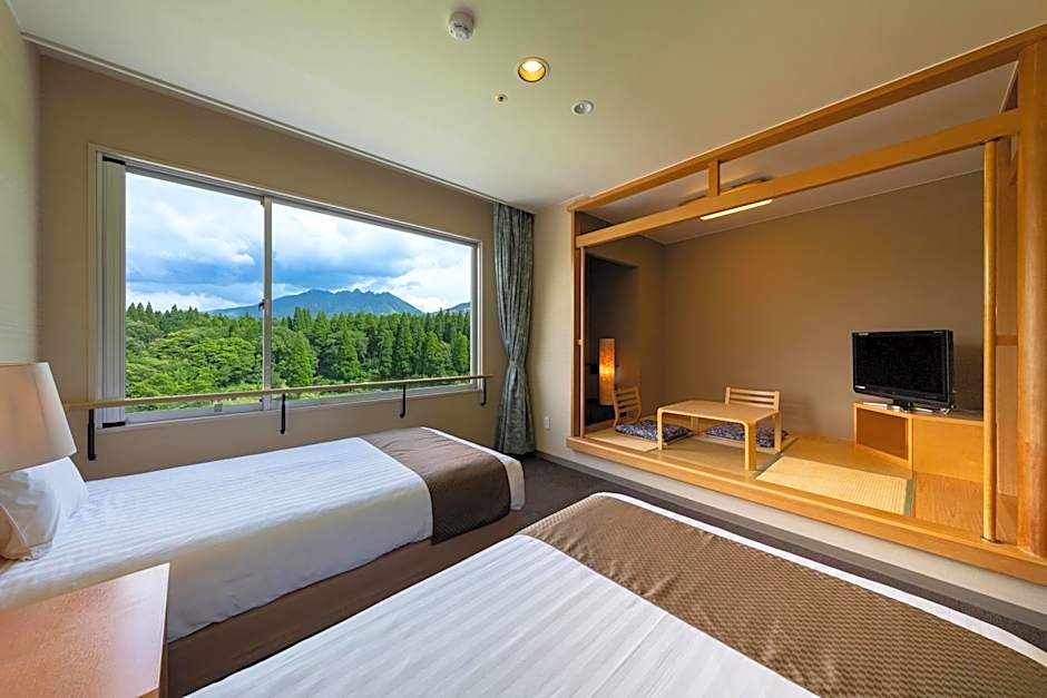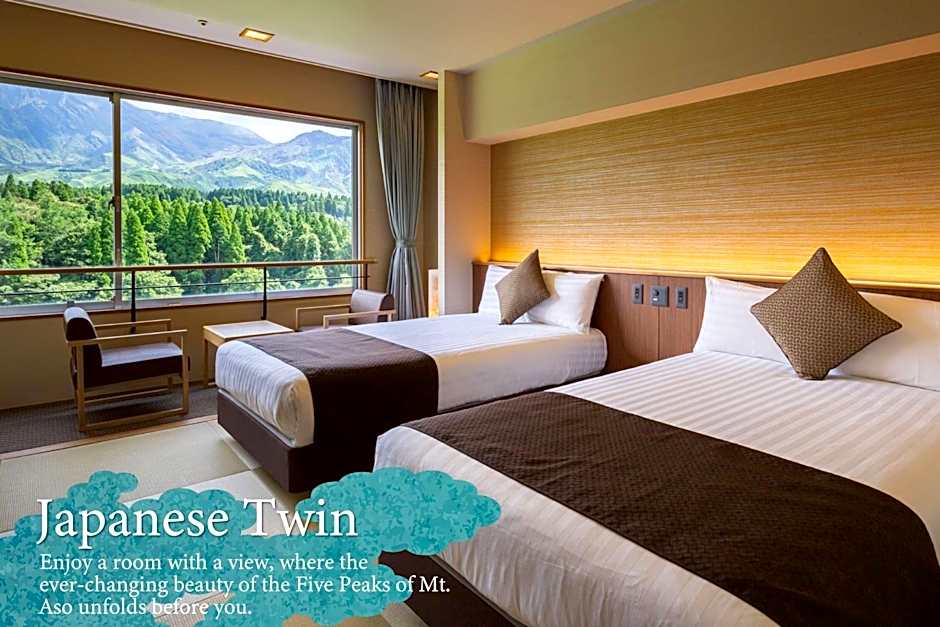 幅広い客室が用意されており、カップル、家族、グループ向けに和室やモダン和風のツインから、専用バスルーム付きのくまモンをテーマにした客室、さらに4名用や5名用(クインタプル)のゆったりした間取りまで選べます。目立つ例としては、ツイン2台のスーペリアルーム(323平方フィート)や、和室(畳)、クインタプル(5名用)、シングルユース、専用バスルーム付きの部屋(398平方フィート)があります。
