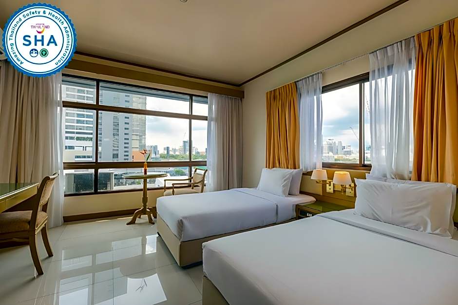 I have known this hotel since 2004 and I have regularly stayed there when visiting Bangkok (maybe a dozen of stays). Its main quality is its location, very near the Lumpinee MRT underground station, as well as in walking distance from the Silom area. The hotel is already a little old but is well maintained and offers the comfort one expects from a three star establishment. The rooms are quiet, spacious and luminous (I always book a Deluxe room, situated in one of the top floors). The bed is very comfortable. Complimentary water (one bottle for every guest) is offered every day. The breakfast buffet offers a good choice of Asian and European dishes. Two recent improvements: checkout time is now 12:00 (it was 11:00 before); once breakfast time is over (10:00 am), coffee and tea are made freely available in the lobby until noon.