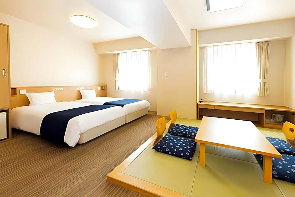 The hotel offers various room types including Standard, 2 Beds, Standard 2 Beds, 1 Double Bed, Twin Room, Room with Tatami Area, and Double Room with Small Double Bed. Smoking is not allowed in any of the rooms. The rooms can accommodate either 2 adults and 1 child or 4 adults, depending on the room type. Bed sizes range from Twin, Double, to Futon Mat.