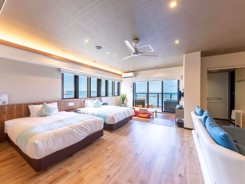 Guests will have a special experience as the quadruple room offers a private open-air bath. The spacious quadruple room provides air conditioning, a tea and coffee maker, a terrace with sea views as well as a private bathroom featuring a bath. The unit offers 2 beds and 2 futons.