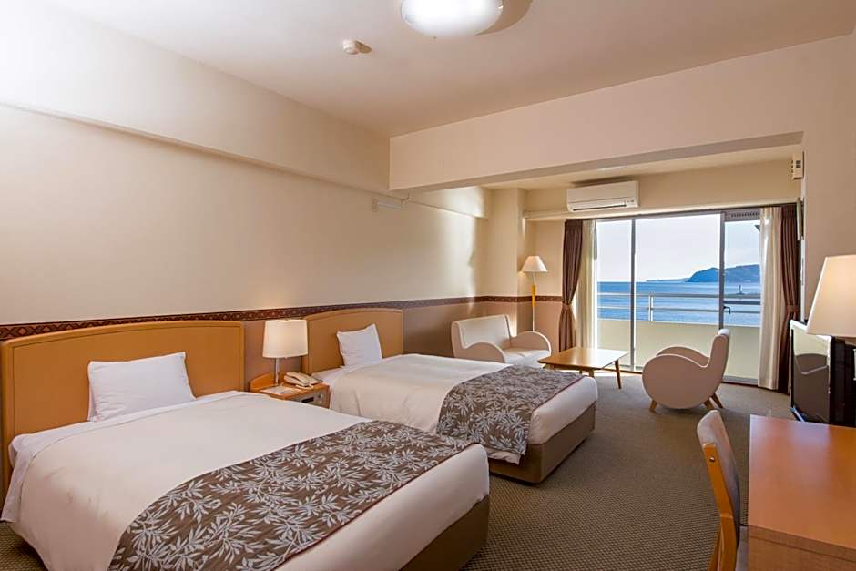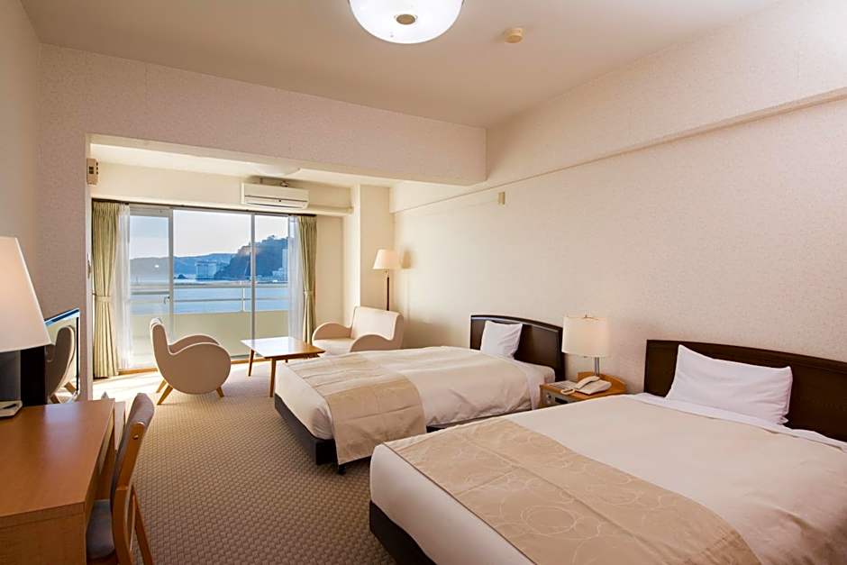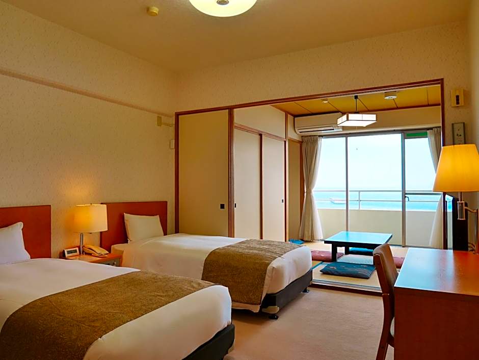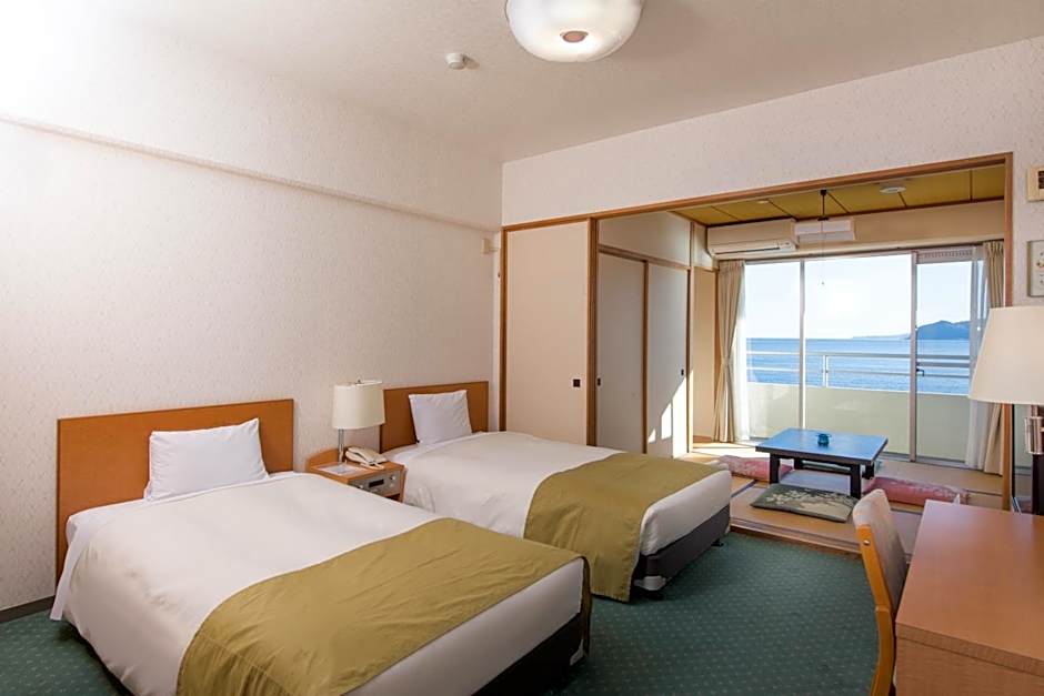 The quadruple room features air conditioning, tatami, a balcony with sea views as well as a private bathroom boasting a bath. The unit has 2 beds and 2 futons.