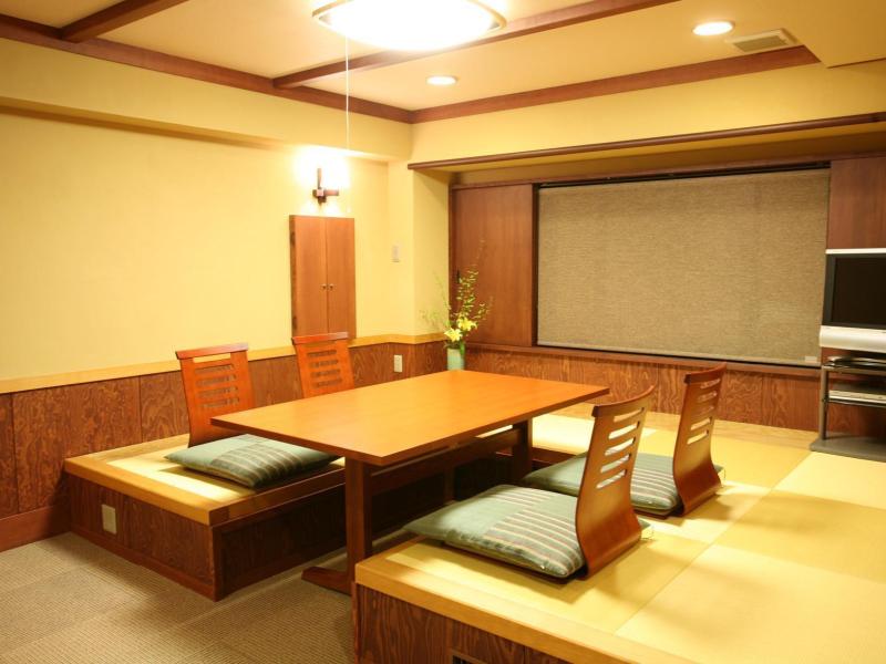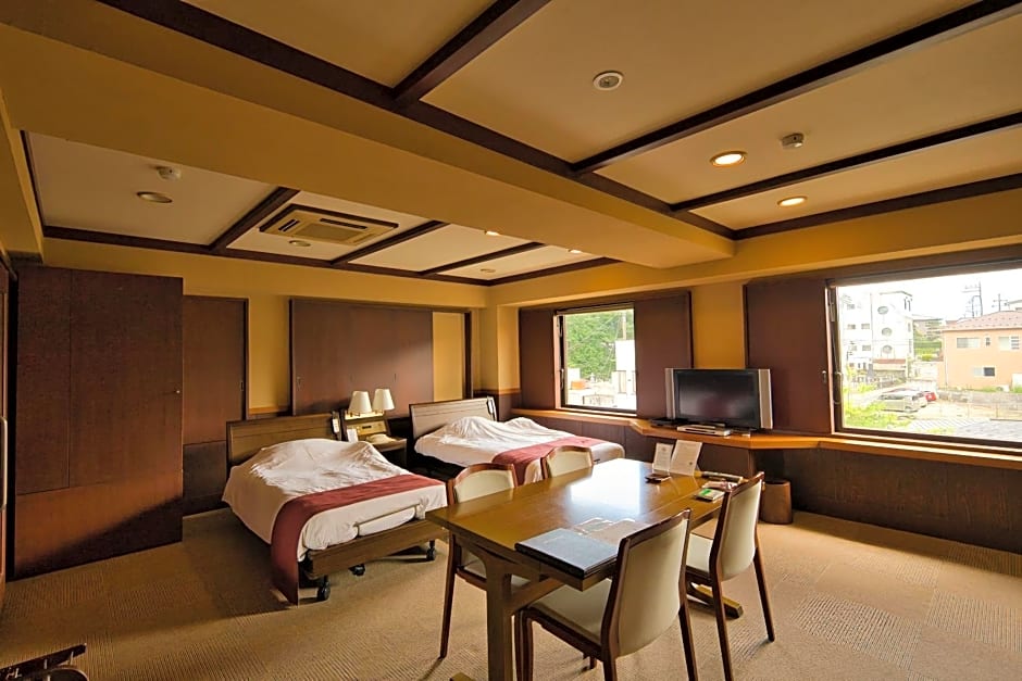 This quadruple room's special feature is the private open-air bath. The spacious air-conditioned quadruple room features a flat-screen TV, a safe deposit box, an electric kettle and yukata. The unit has 2 beds and 2 futons.