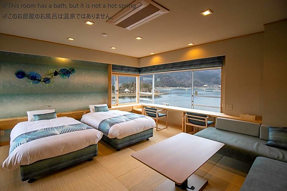 This quadruple room features a private open-air bath. The spacious air-conditioned quadruple room provides a flat-screen TV, a safe deposit box, an electric kettle, yukata as well as lake views. The unit offers 3 beds and 1 futon.
