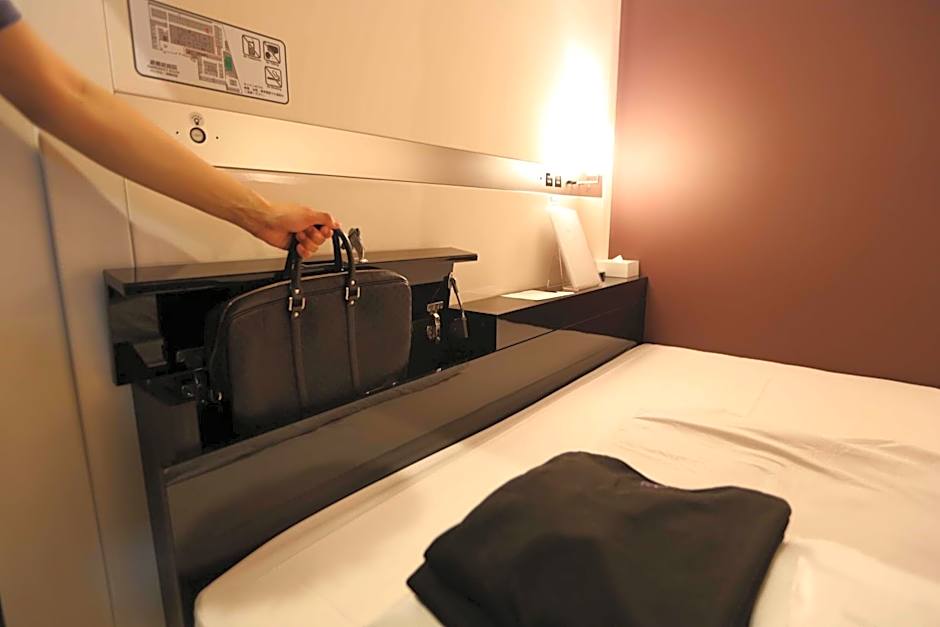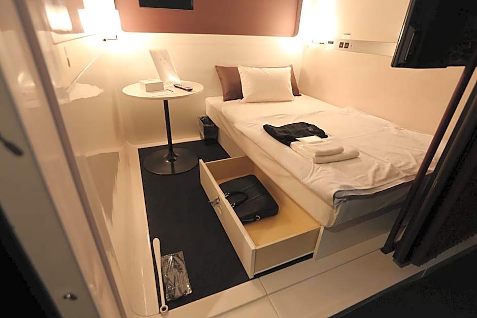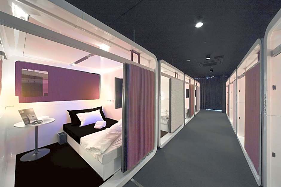 Spacious sleeping capsules are placed side by side in shared rooms, separate by gender. They are fitted with an LCD TV, a night stand and a safe. Shared bathing facilities include hot public baths, shower booths and luxury amenities. This capsule room is for female guests only.