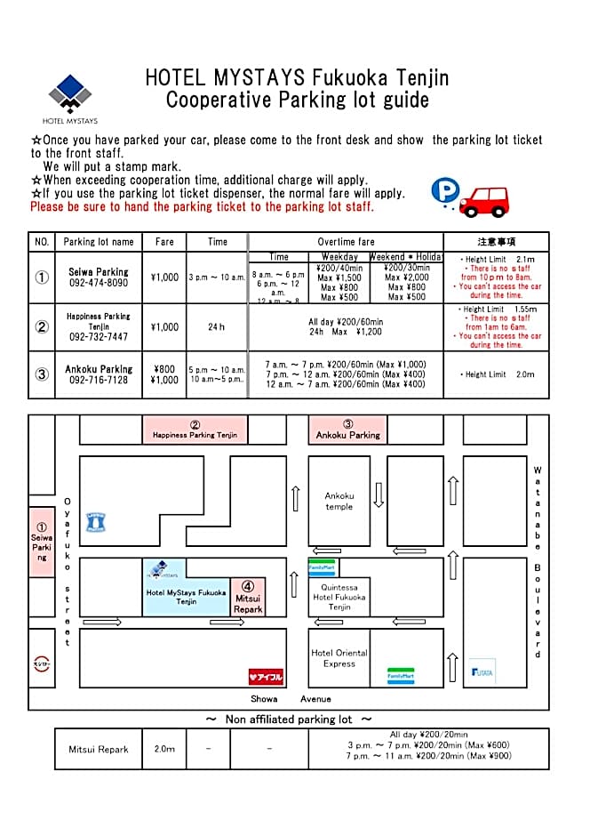Public parking is available at a location nearby (reservation is not possible) and costs JPY 2000 per day.