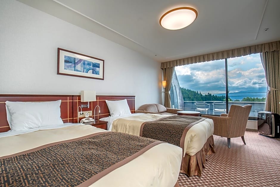 Location and view. There is a big hotspring facility next door but the hotel offers it too. short distance from Gotemba station.