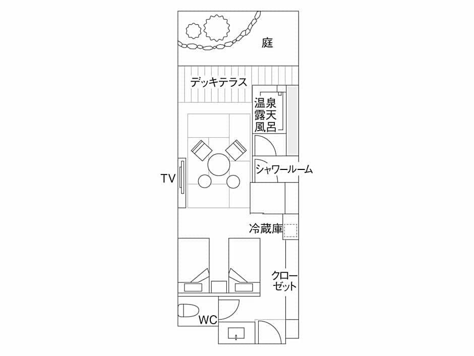 This double room's special feature is the private open-air bath. The spacious double room provides air conditioning, a tea and coffee maker, as well as a private bathroom featuring a bath and a shower. The double room features a flat-screen TV with satellite channels, a safe deposit box, yukata and heating. The unit offers 1 bed.