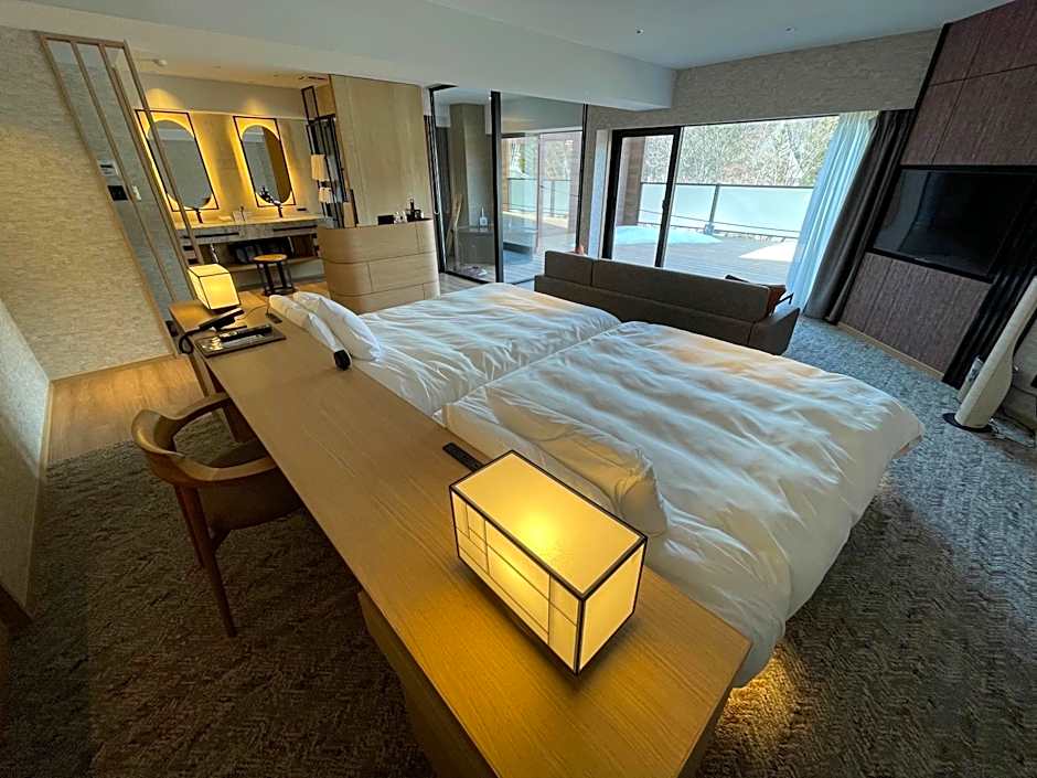 Love the private onsen. Well designed and spacious of the room. Hotel even provide a small bottle of champagne for us. What we see on the website regarding the room and the hotel surrounding is exactly what we see when we there. 👍 We also love the public onsen where there is indoor and outdoor. Love the unlimited snow crab dinner buffet. Hotel also has a lot of nice, comfortable resting area. Love the hotel able to provide transport to bus terminal and Yabatake town.
