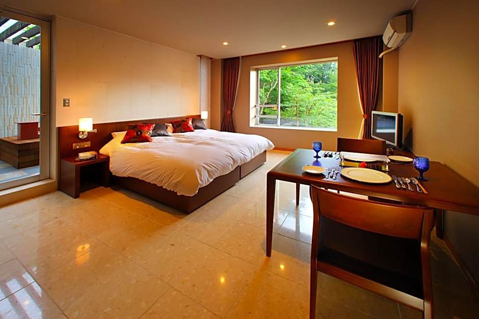 The private open-air bath is the standout feature of this double room. The spacious double room features air conditioning, a seating area, a balcony with mountain views as well as a private bathroom boasting a bath. The unit has 1 bed.