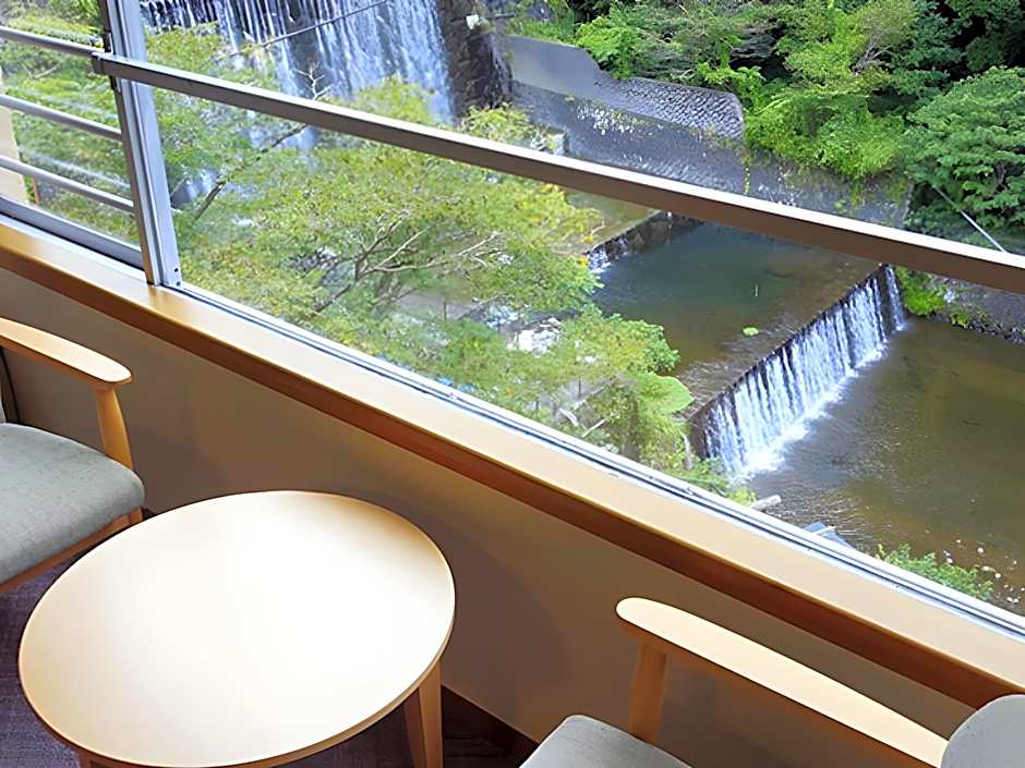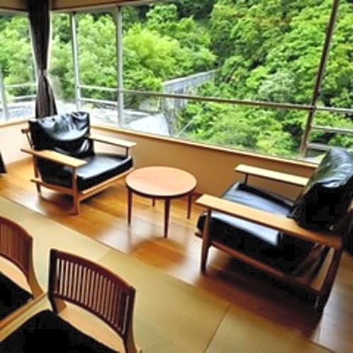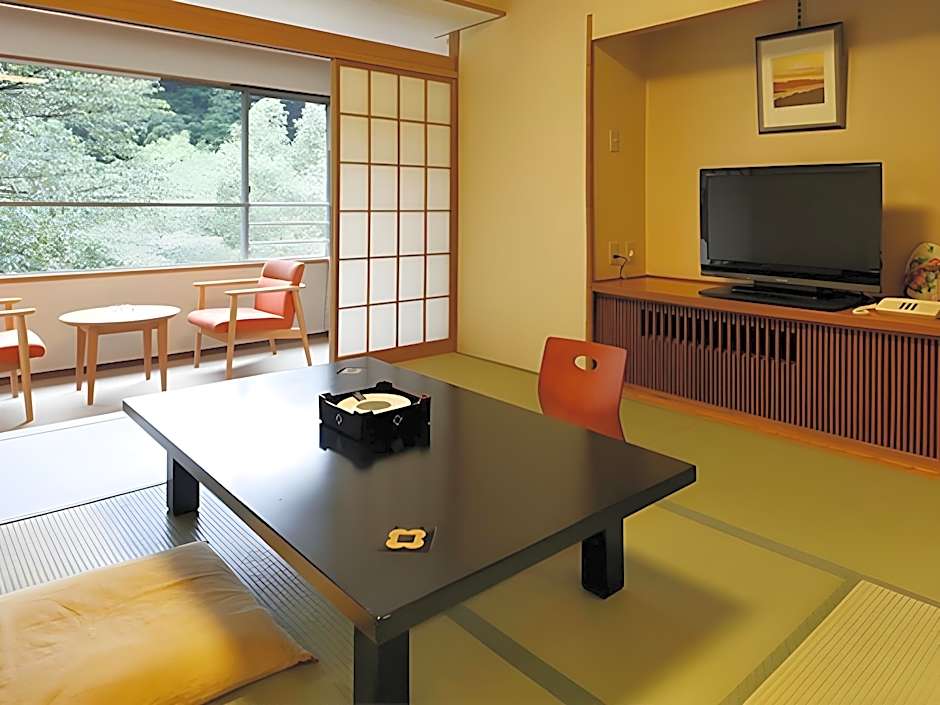 This twin room's standout feature is the private open-air bath. The twin room includes a private bathroom, well-fitted with a bath, a shower, a bidet, a hairdryer and slippers. The air-conditioned twin room offers a flat-screen TV, tatami, a tea and coffee maker, yukata as well as river views.