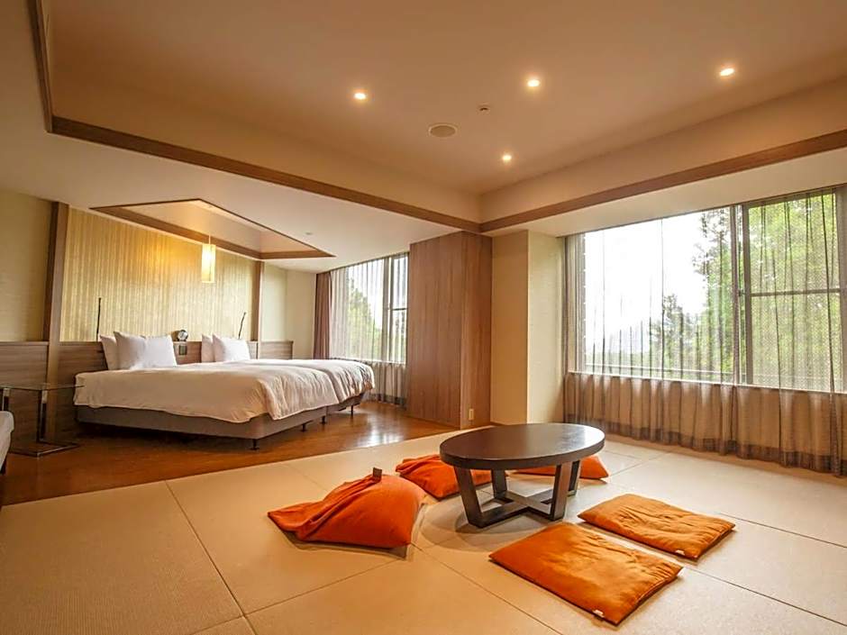 This quadruple room's special feature is the private open-air bath. The spacious quadruple room offers air conditioning, a seating area, a balcony with mountain views as well as a private bathroom boasting a bath. The unit has 2 beds and 3 futons.