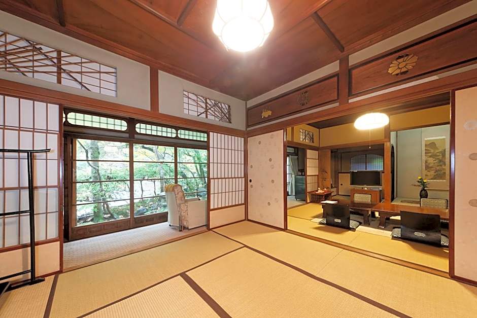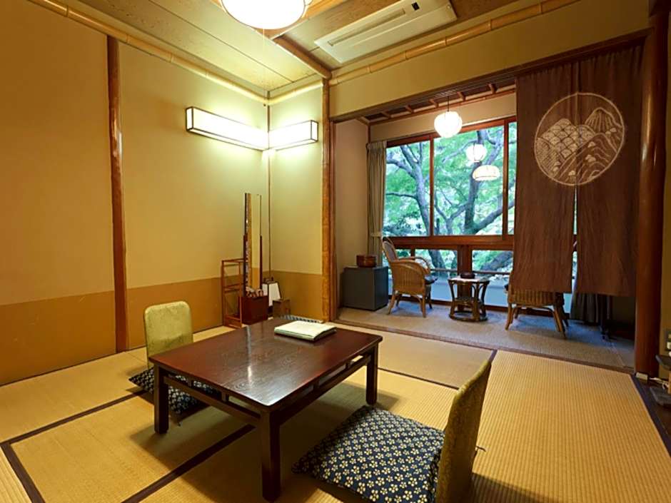 Features tatami (woven-straw) flooring and Japanese futon bedding. Air-conditioned room with garden views, a fridge and a TV. Bathrooms and toilets are shared.