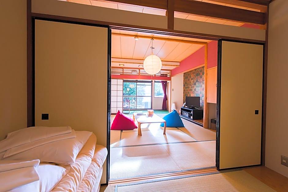 The quadruple room offers air conditioning, tatami, as well as a shared bathroom featuring a bidet and a hairdryer. The quadruple room features a TV, a wardrobe, a safe deposit box, an electric kettle as well as mountain views. The unit offers 4 futons.