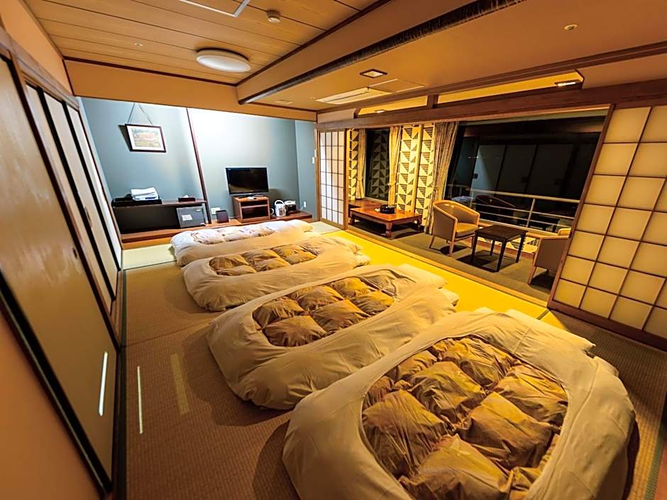 The spacious family room provides air conditioning, tatami, a terrace with sea views as well as a private bathroom featuring a bath. The unit offers 5 futons.