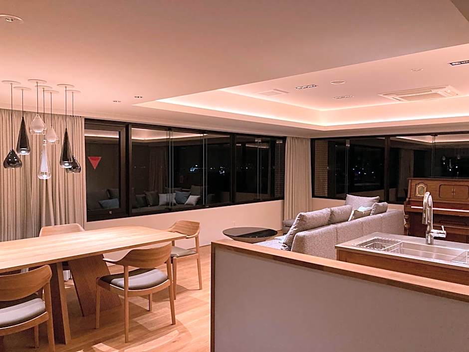 The suite includes a private bathroom, well-fitted with a bath, a shower, a bidet, a hairdryer and slippers. Guests can make meals in the kitchen that is equipped with a stovetop, a refrigerator, kitchenware and a microwave. The spacious air-conditioned suite provides a flat-screen TV with satellite channels, tatami, a dining area, a wardrobe as well as sea views. The unit offers 2 beds and 3 futons.