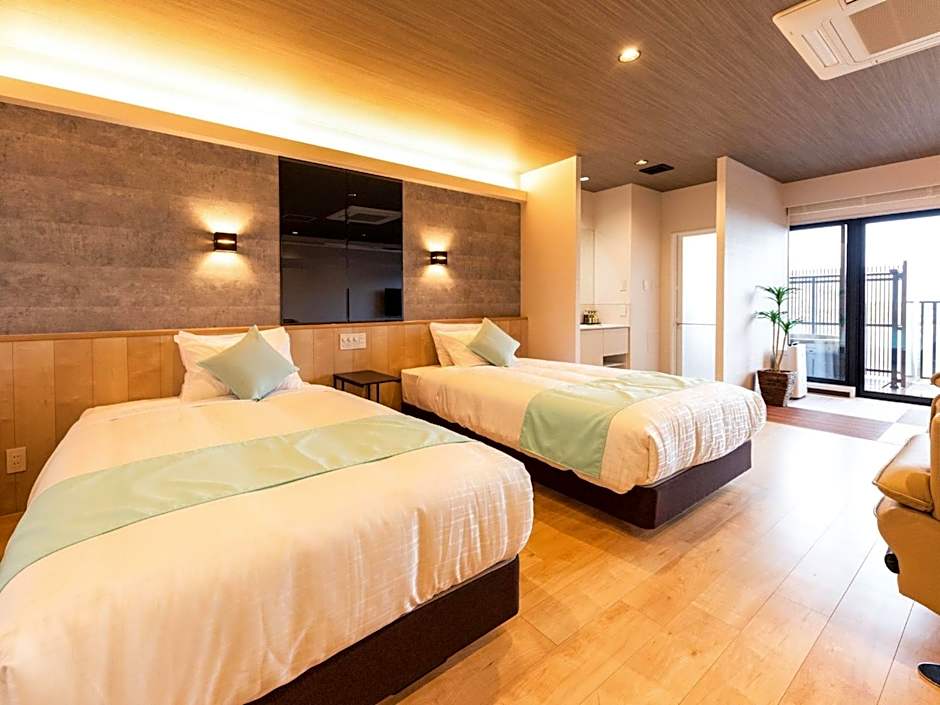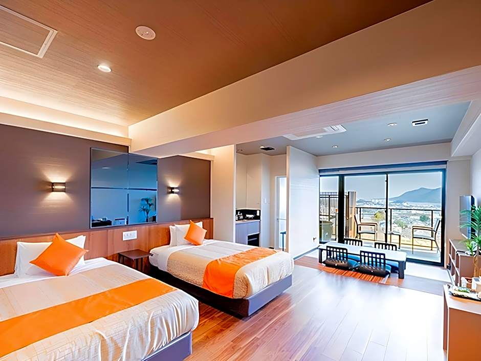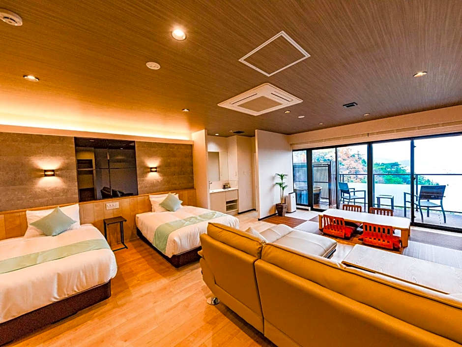 This luxurious suite provides a pool with a view, a hot tub and a private open-air bath. This spacious suite is consisted of of 1 living room, 1 separate bedroom and 1 bathroom with a walk-in shower and free toiletries. The air-conditioned suite offers a flat-screen TV with satellite channels, tatami, a tea and coffee maker, a wardrobe as well as sea views. The unit offers 2 beds and 2 futons.