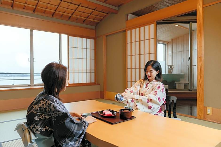 Guests will have a special experience as the family room features a private open-air bath. The family room includes a private bathroom, well-fitted with a bath, a shower, a bidet, a hairdryer and slippers. The air-conditioned family room provides a TV, tatami, a tea and coffee maker, a seating area as well as lake views. The unit offers 2 beds and 4 futons.