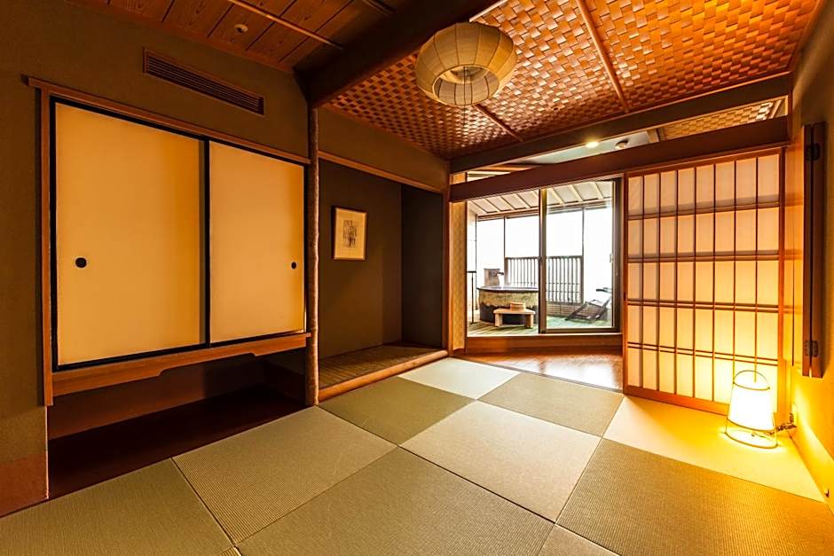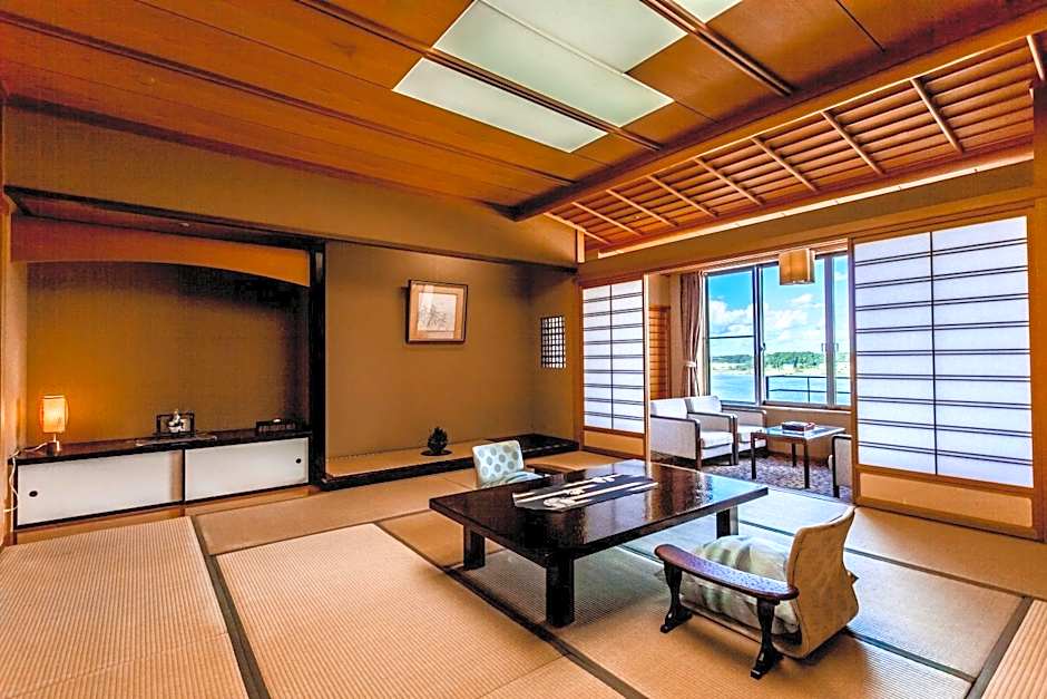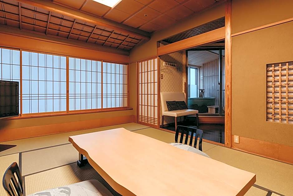 This family room features a private open-air bath. The family room includes a private bathroom, well-fitted with a bath, a shower, a bidet, a hairdryer and slippers. The air-conditioned family room features a TV, tatami, a seating area, a safe deposit box as well as lake views. The unit has 2 beds and 3 futons.