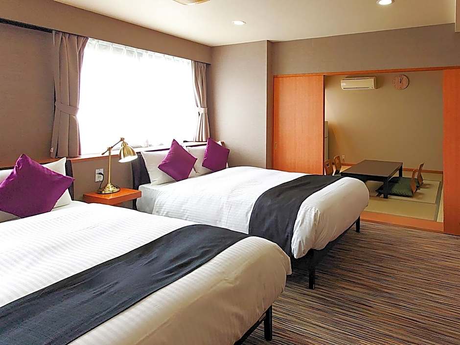 Hotel Kazusa offers a variety of room types including Japanese-Style Twin, Twin, Single, and Double rooms. Smoking is allowed in some rooms while non-smoking rooms are also available. Bed sizes vary from Twin to Double, with room sizes ranging from 129 sqft to 194 sqft, accommodating 1 to 2 adults per room.