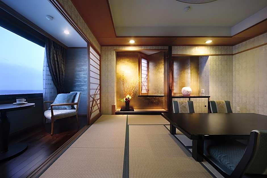 This spacious room features tatami (woven-straw) flooring, a low table and seating cushions. Each comes with a refrigerator, an electric kettle and an LCD TV. The seating area comes with an ocean view.