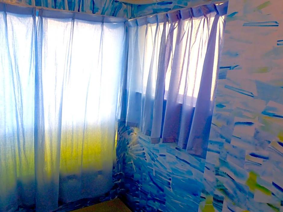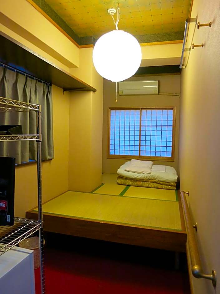 Features tatami (woven-straw) flooring and Japanese futon bedding. Bathrooms and toilets are shared. Small air-conditioned room with an LCD TV and a refrigerator.