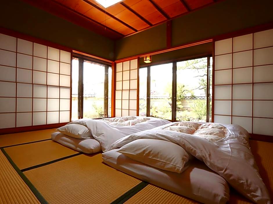 This family room is air-conditioned and features a shared bathroom, tatami and garden views. The unit offers 5 futons.