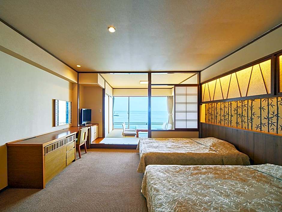 The quadruple room includes a private bathroom, well-fitted with a bath, a shower, a bidet, a hairdryer and slippers. The spacious air-conditioned quadruple room provides a flat-screen TV, tatami, a wardrobe, a safe deposit box as well as sea views. The unit offers 2 beds and 3 futons.