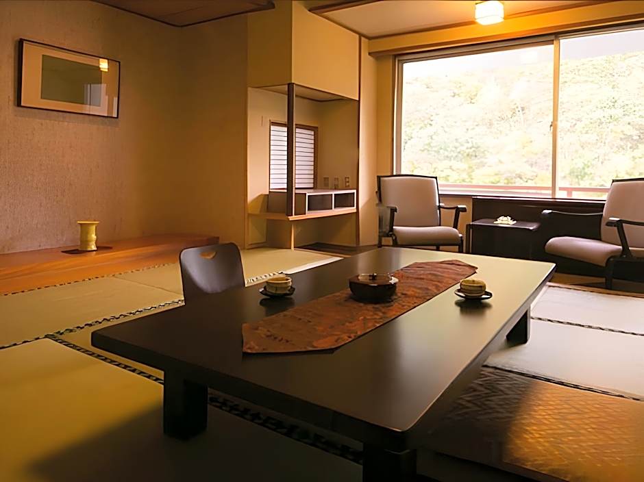 Beautiful ryokan, there's traditional music performance at the centre of the lobby from 4pm-6pm. The manga/anime Demon Slayer infinity castle based on this hotel. Well presented and tasty kaiseki dinner, good selection of breast buffet and great customer service. Available yukata that fit all sizes including baby/toddler (very cute). Spacious Japanese room with river view, although the facilities/furnitures are quite old. Interesting public bath with three tiers open bath with river/mountains view. Not so convenient to travel on public transport, but great with rental car to get there.
