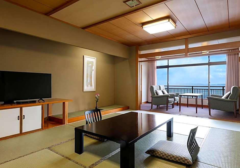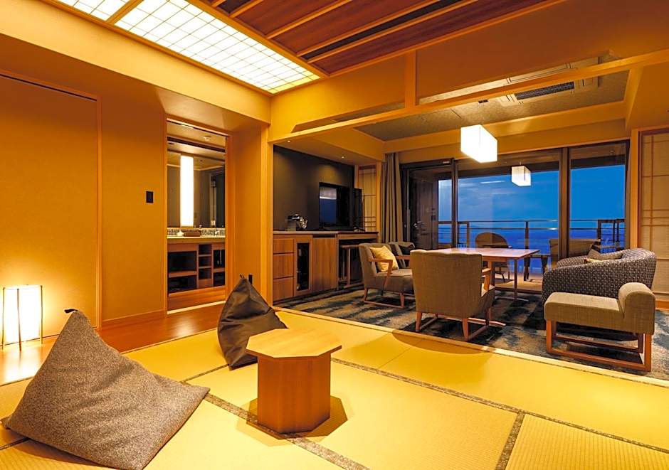 Guests will have a special experience as this family room provides a private open-air bath. The spacious family room offers air conditioning, tatami, a terrace with sea views as well as a private bathroom featuring a bath. The unit offers 2 beds and 3 futons.
