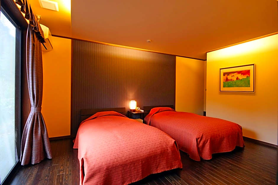 Wooden freestanding house boasting a half open-air bathroom with a cedar bath, nature views through floor-to-ceiling windows and a balcony. It's air-conditioned and features a living room with sofas, a dining area and a bedroom with 2 single beds. A Japanese-style room has a tatami (woven-straw) floor, a low table with seating cushions and traditional futon bedding. Amenities include a flat-screen TV, a CD player and a fridge. Bathrobes and toiletries are provided.
