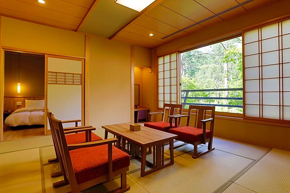 This suite offers a private open-air bath. This spacious suite consists of 1 living room, 1 separate bedroom and 1 bathroom with a bath and free toiletries. The air-conditioned suite provides a TV, tatami, a wardrobe, a safe deposit box as well as mountain views. The unit offers 3 beds and 2 futons.