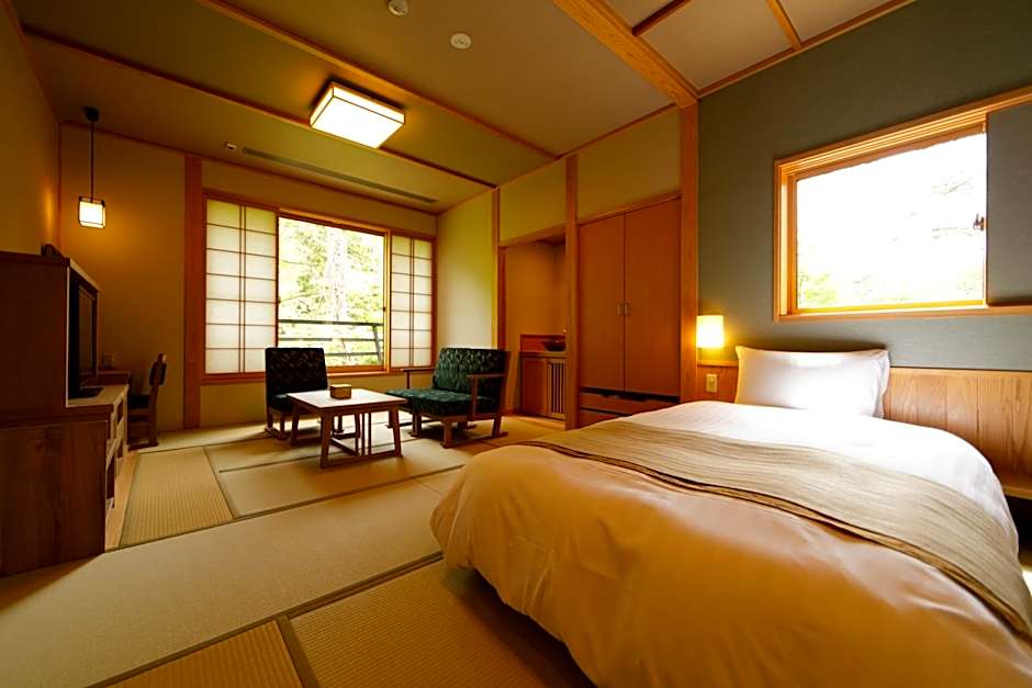 The spacious double room features air conditioning, a wardrobe, as well as a private bathroom boasting a bath and a shower. The double room offers a safe deposit box, an electric kettle, yukata, a TV, as well as mountain views. The unit has 1 bed.