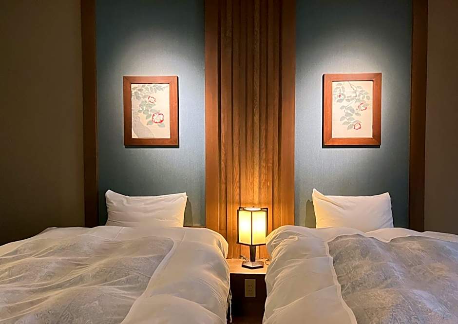 Providing free toiletries, this twin room includes a shared bathroom with a bidet, a hairdryer and slippers. The air-conditioned twin room provides a tea and coffee maker, a wardrobe and yukata. The unit offers 2 beds.