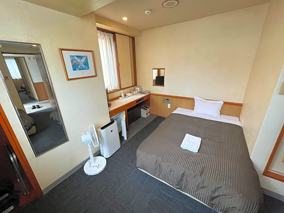 Features a semi-double bed (47 in wide). Room comes with an private bathroom, a fridge and an electric kettle with green tea bags. Japanese Yukata robes and toothbrush sets are provided for all guests. Room has no AC.