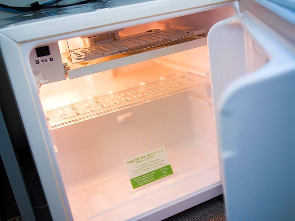 Rooms feature dark carpeting, offset by a yellow wall. They are furnished with an LCD TV, a fridge and an air cleaner/humidifier. There is free wired internet in addition to Wi-Fi, and an attached bathroom.