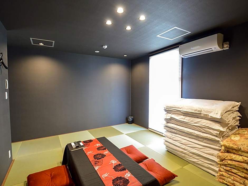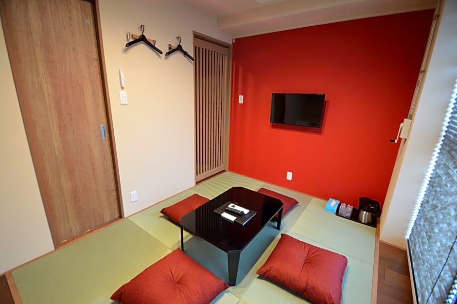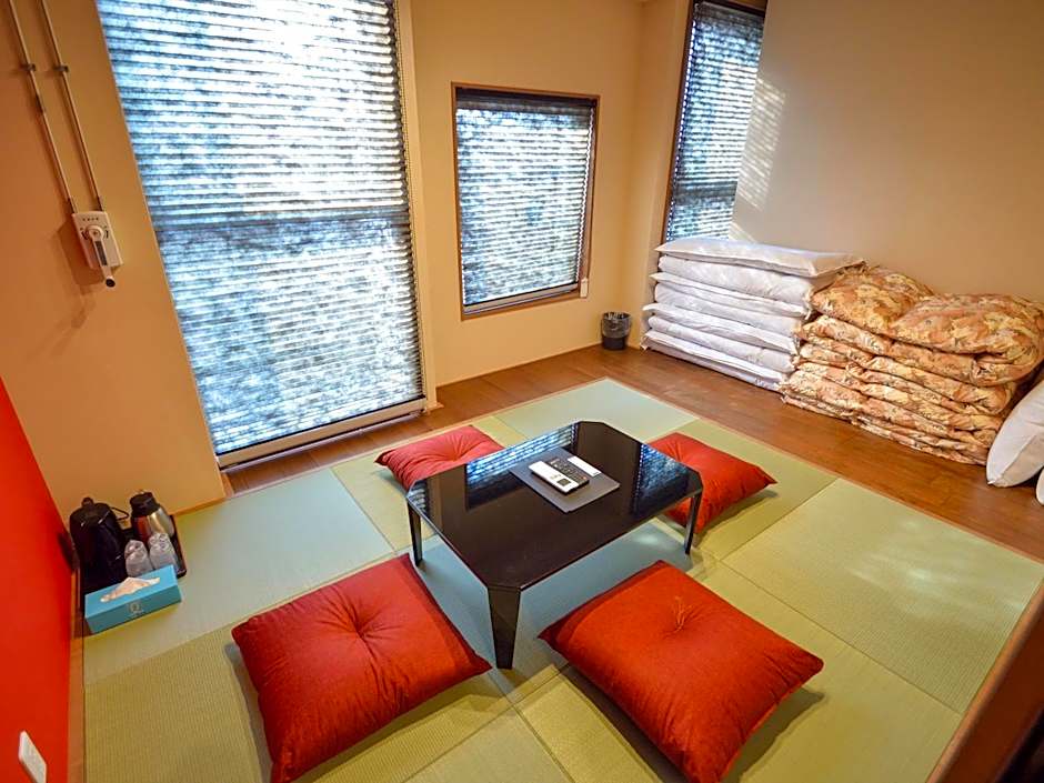 This Japanese-style room features Japanese futon bedding, a TV, table and an electric kettle. There is a private toilet and an private bathroom that comes equipped with a shower.