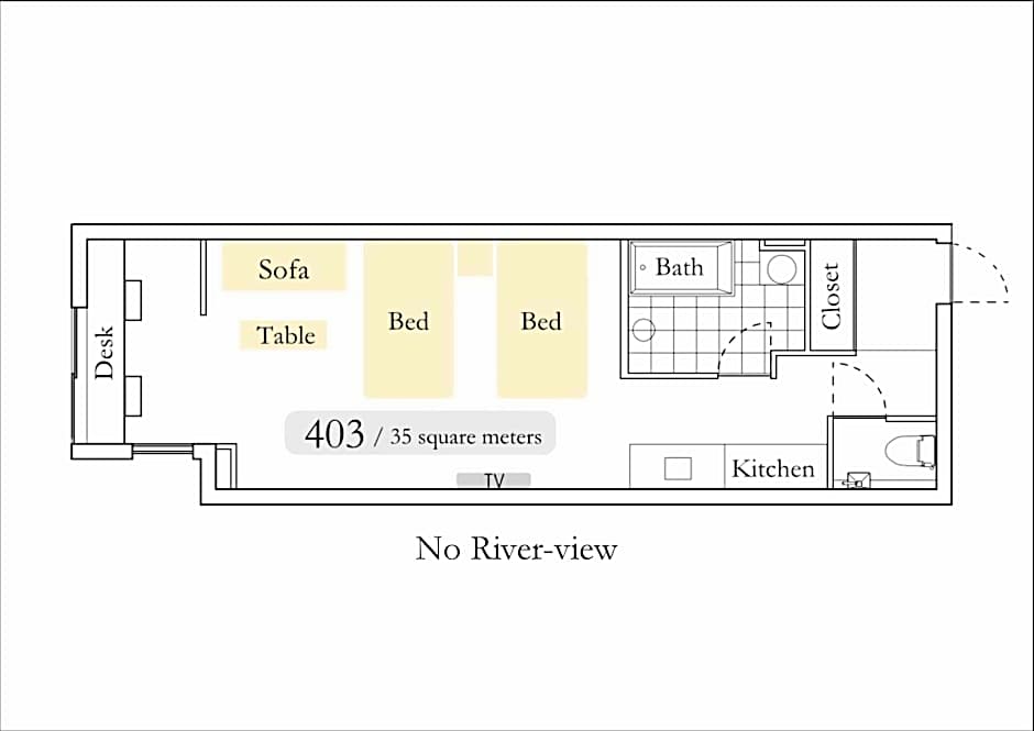 the room layout seems not updated on the web. The real room is modern, cozy and well equipped withOUT kitchen - we thought the apartment is equipped with the cooking facility, but it doesn't. However, everything is perfect - the location, the facility in the room. Room has 70 sqm with balcony river view.