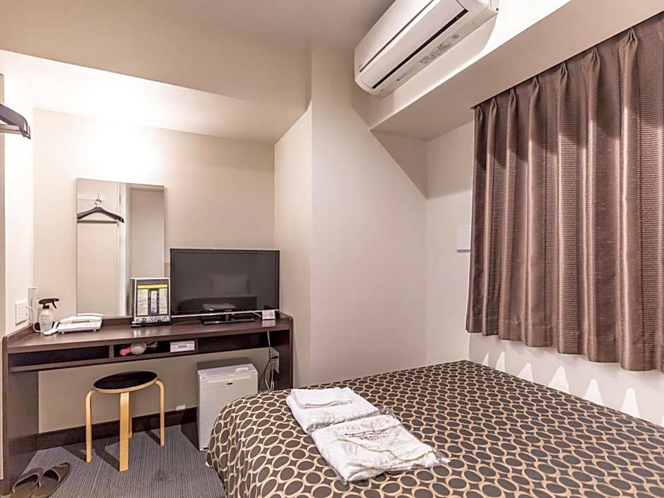 Hotel is a 5 to 10 minute walk from the train station, one block from the Aeon mall [supermarket inside]. Google maps sometimes confuses this with similarly named hotels. Take the west exit from the train station, turn right, past the book store, watch across the road for the Aeon mall [set a half block back]. Cross the busy road and walk to the mall, turn right onto the lane just in front of the mall. The hotel entrance is at the end of the block on your left. Clean and comfortable.