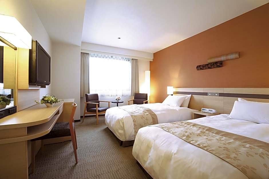 The Karasuma Kyoto Hotel offers Twin Rooms with single occupancy for smoking guests. These rooms have a size of 237 sqft and can accommodate up to 2 adults and 1 child. The room is furnished with 2 Twin beds.