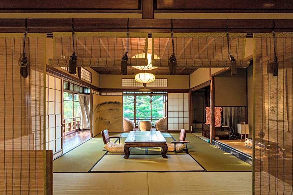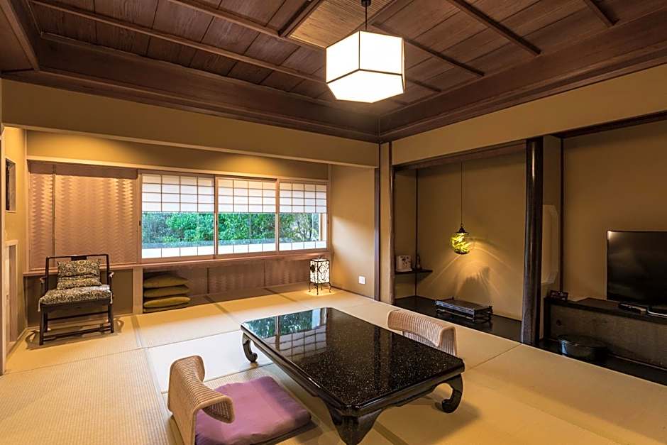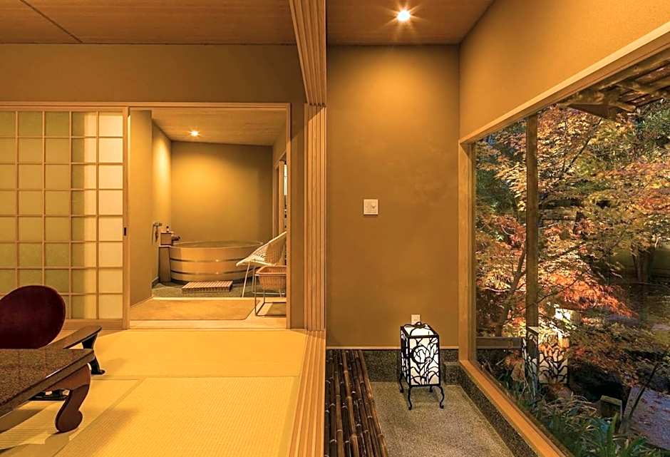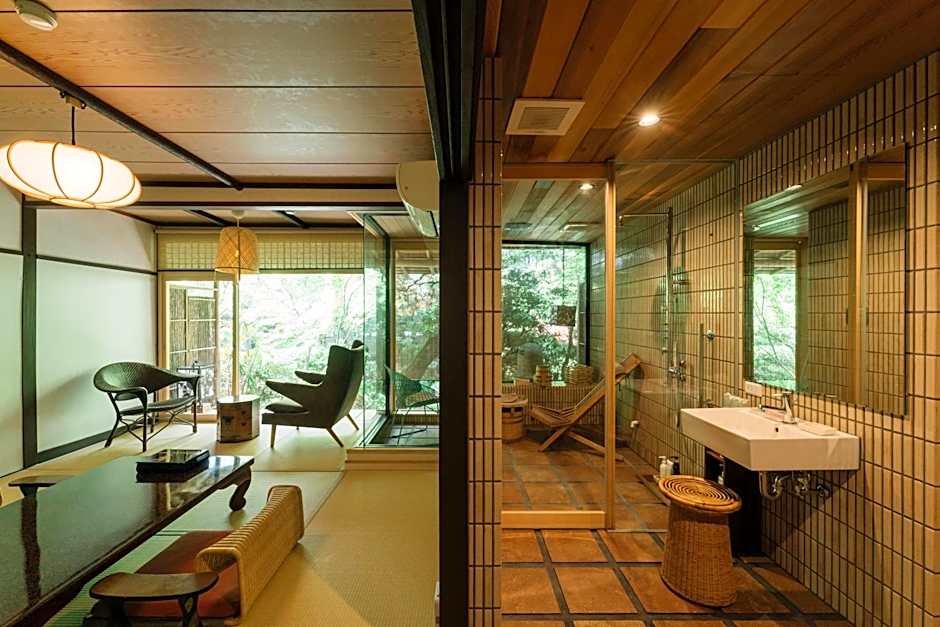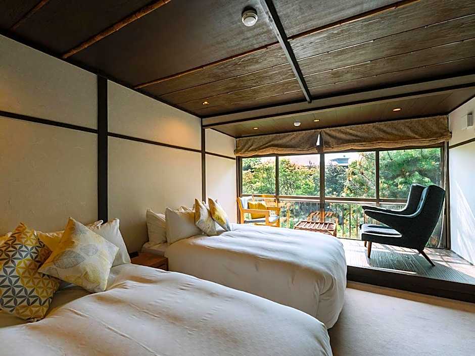 Features garden views, this maisonette style room in the main building is consisted with a 10 tatami mats Japanese style + Western room with two semi-double beds+ steam sauna which is manufactured by TYLOHELO in Sweden and shower / toilet. An private bathroom with a large glass window features a bathtub made from Japanese cypress and the scent of cypress drifts in the sauna room You can enjoy the garden of the four seasons from the bay window.