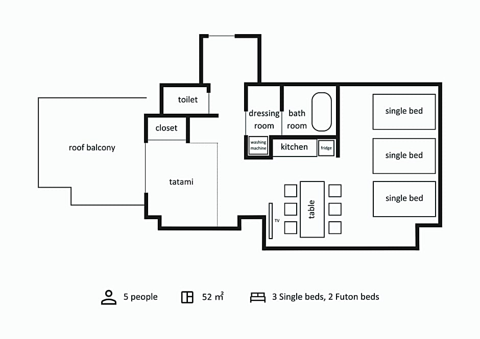 The spacious quadruple room provides air conditioning, a washing machine, as well as a private bathroom featuring a bath and a shower. Guests can make meals in the kitchen that comes with a refrigerator, kitchenware, a microwave and an electric kettle. The quadruple room features tatami, soundproof walls, a dining area, a wardrobe, as well as a flat-screen TV. The unit offers 2 beds and 2 futons.