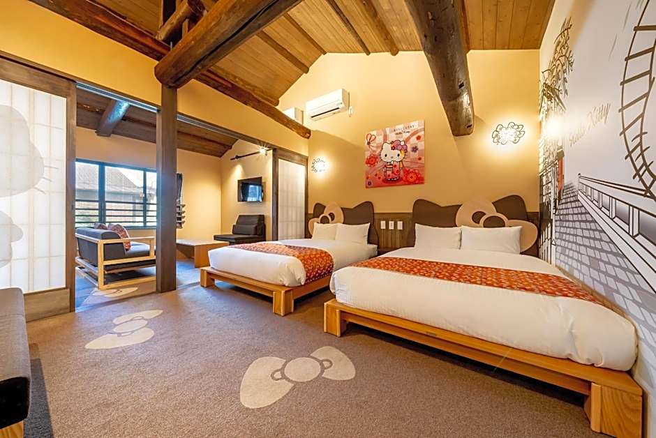 Whimsical Hello Kitty-themed options add a playful twist, including a Hello Kitty room and Hello Kitty, 3 Bed (453 sqft). Capacity for both is listed as 2 adults and 1 child, making for family-friendly stays without sacrificing style.