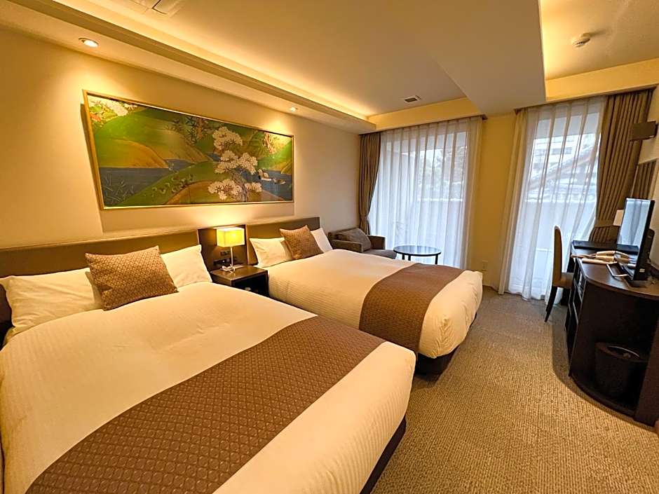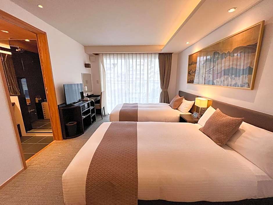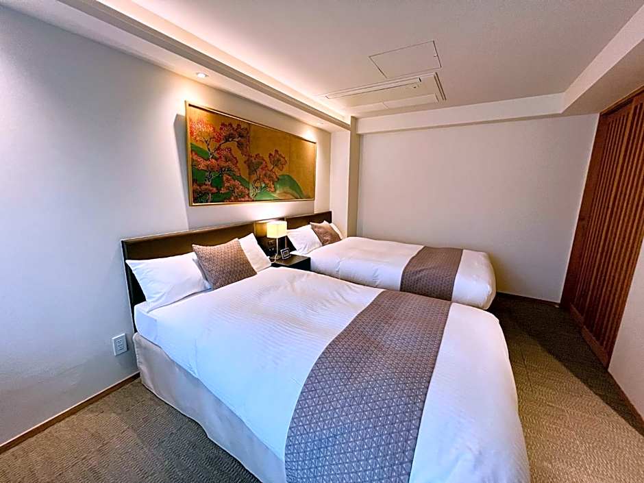 This room features traditional Japanese-style decor such as a folding screen with gold leaf and ukiyo-e, or woodblock prints of traditionally Japanese motifs. Guests can enjoy the viewin Kyoto from the balcony of this room.The room is equipped with 2 Sealy beds (44 in wide), TV and BOSE audio set. The kitchen has a microwave, refrigerator, coffee maker and basic kitchenware. This room has a private bathroom with a shower and a bath tub made from Chinese black pine wood.