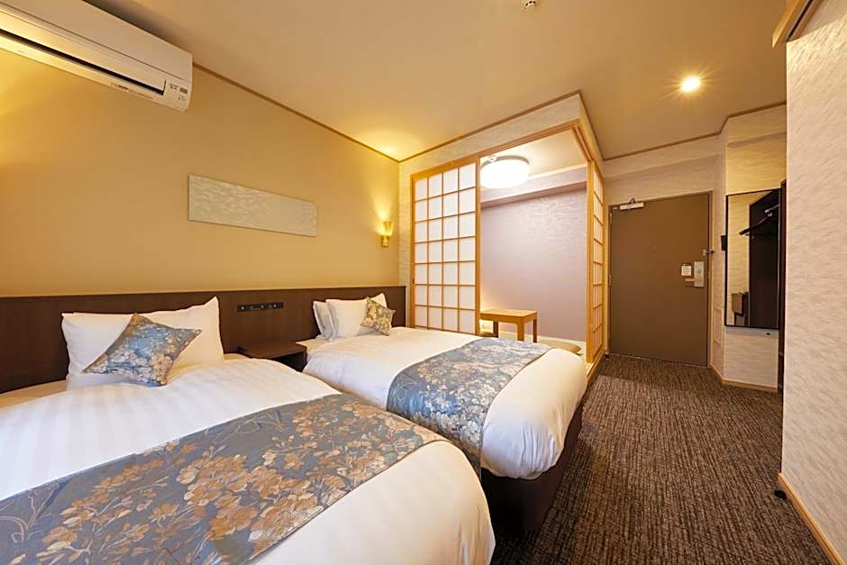 The twin room includes a private bathroom, well-fitted with a bath, a shower, a bidet, a hairdryer and slippers. The twin room features air conditioning, tatami, soundproof walls, Smartphone and a flat-screen TV. The unit has 2 beds.