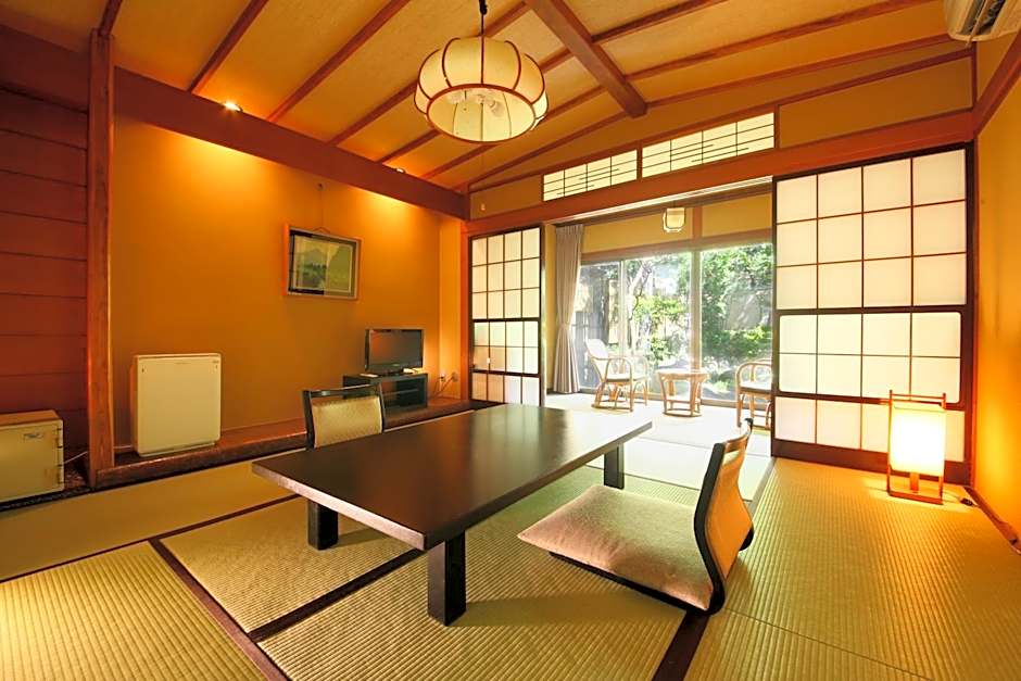 This room features a tatami (woven-straw) floor, and features an attached bathroom with garden views. It's located in the new wing and furnished with low furniture and traditional futon bedding.