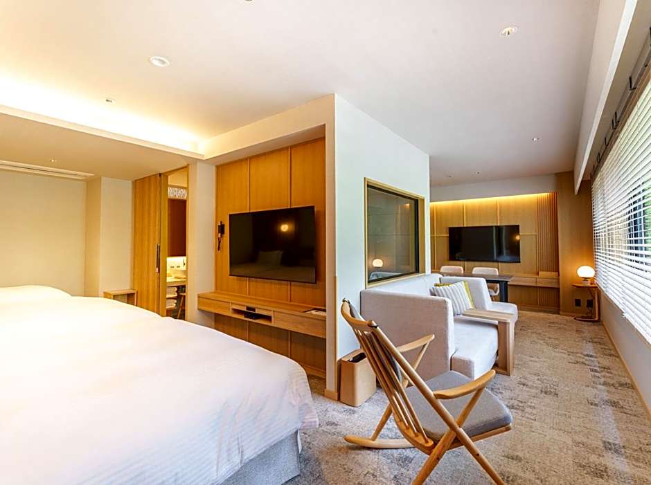 The spacious family room offers air conditioning, tatami, as well as a private bathroom boasting a bath and a shower. The family room has carpeted floors, a seating area with a flat-screen TV, a coffee machine, a wardrobe as well as mountain views.