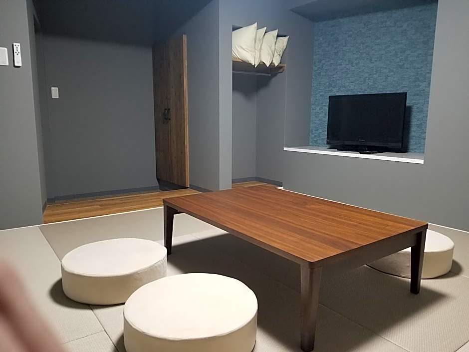 The family room offers air conditioning, tatami, as well as a shared bathroom featuring a shower and a bidet. This family room features a wardrobe, heating and a flat-screen TV. The unit offers 3 futons.