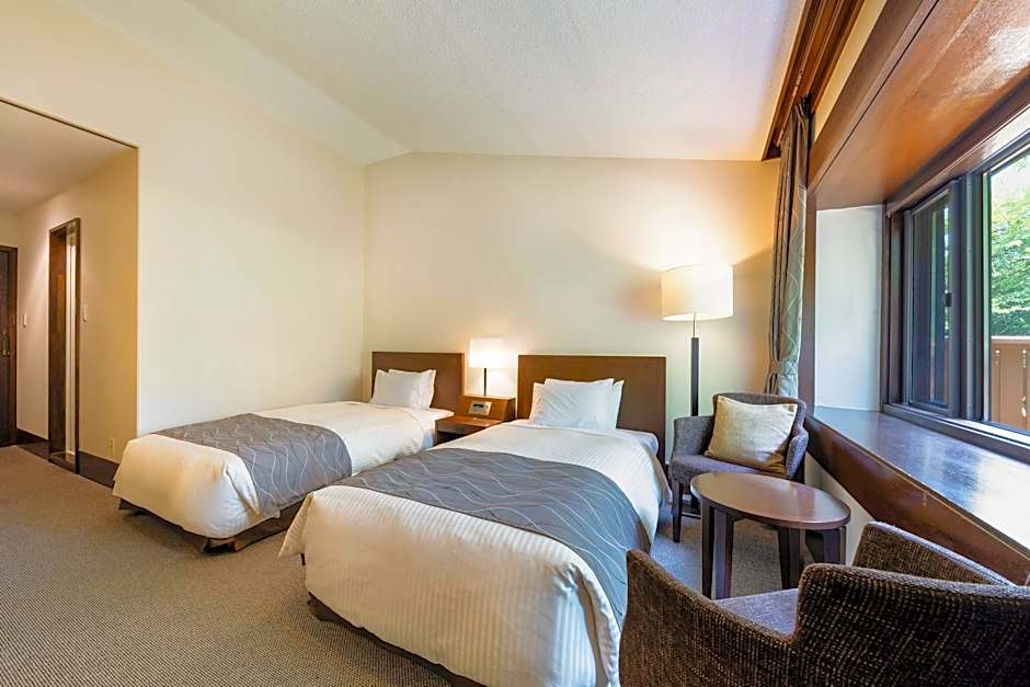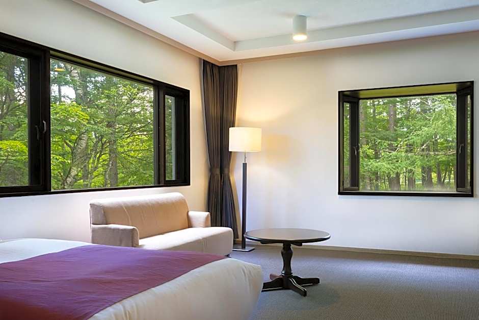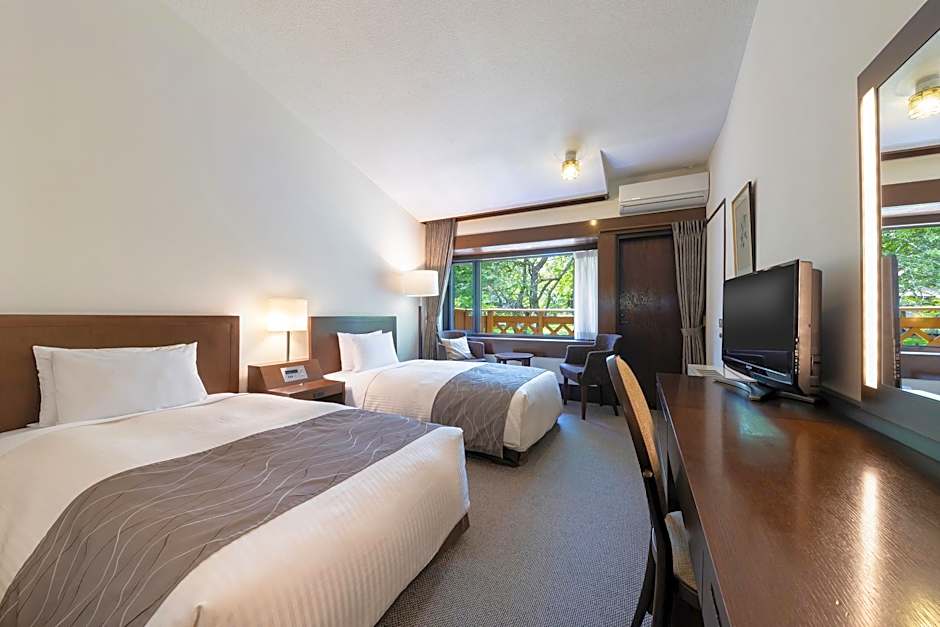 This twin room features a sofa, air conditioning and DVD player. The large window and the balcony features views of the forest.