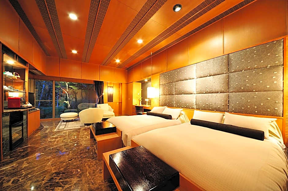 Guests will have a special experience as the quadruple room features a private open-air bath. Providing free toiletries, this quadruple room includes a private bathroom with a bath, a shower and a bidet. The spacious air-conditioned quadruple room provides a flat-screen TV with satellite channels, a mini-bar, a tea and coffee maker, a seating area as well as garden views. The unit offers 2 beds and 2 futons.
