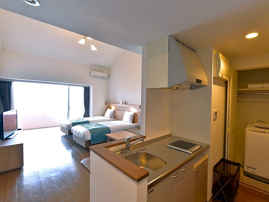 Several room configurations provide space for solo travelers, couples, or small groups, including Twin rooms (some with ocean views) and Apartments. All accommodations are non-smoking and soundproof, featuring air conditioning, a balcony, a bathtub, and free toiletries.